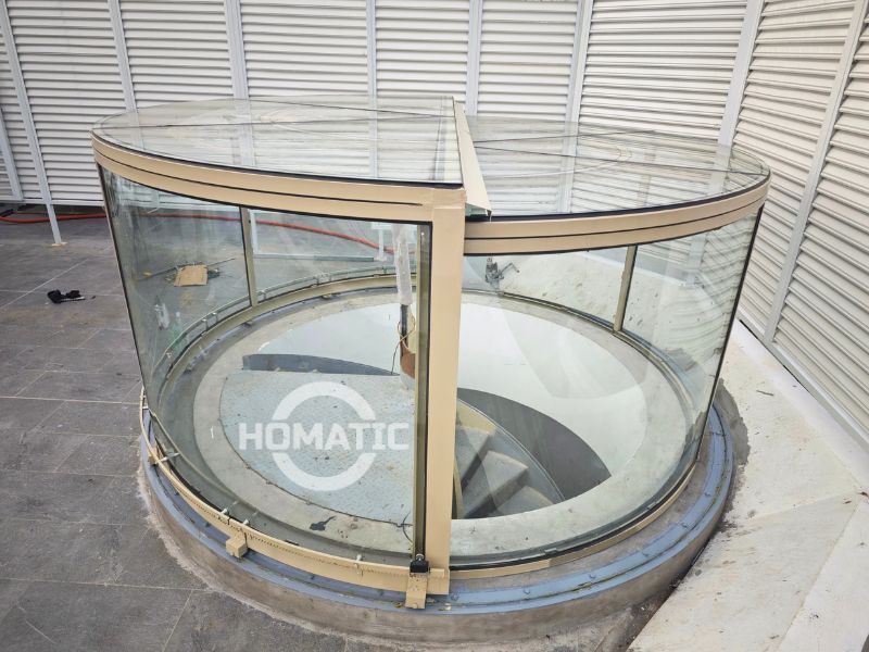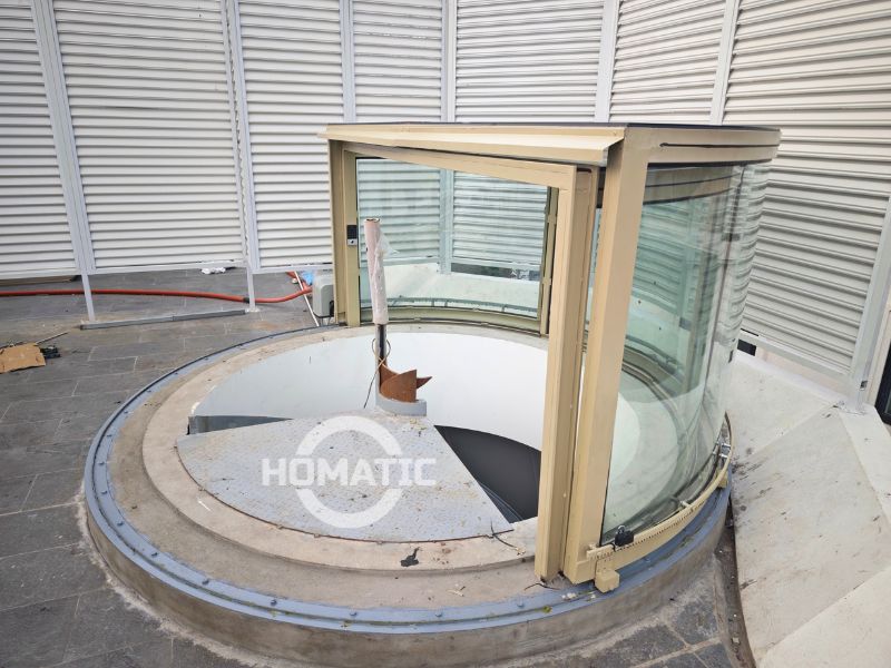 Mái kính tròn tự động cho cầu thang xoắn tầng thượng – Giải pháp lấy sáng hiện đại, sang trọng